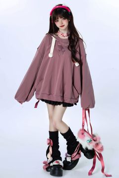 qzchuanda, 1girl, solo, one eye closed, brown hair, bag, v, socks, white background, collar, holding, tongue, black footwear, tongue out, full body, long hair, simple background, bow, sweater, loose socks, black bow, brown eyes, bandaid, holding bag, sleeves past wrists, standing, pink sweater, white socks, looking at viewer