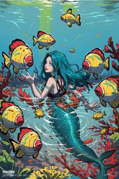 (masterpiece, best quality:1.5)<lora:EpicLogo-000008:0.8>, EpicLogo, Craft an enchanting image of a young and beautiful mermaid with a playful spirit. She possesses a cascade of sky-blue hair that flows in the water, and her aqua eyes sparkle with curiosity. The mermaid is surrounded by a vibrant underwater world, where colorful fish of various shapes and sizes swim around her. Capture the sense of joy and wonder as she interacts with the fish, their scales reflecting a mesmerizing array of hues. The scene is bathed in the gentle glow of sunlight filtering through the water,