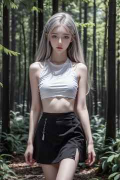 HDR, UHD, 8K, Highly detailed, best quality, masterpiece, 1girl, realistic, Highly detailed, (EOS R8, 50mm, F1.2, 8K, RAW photo:1.2), ultra realistic 8k cg,,jingling,Forest, skirt, silver hair,cyborg