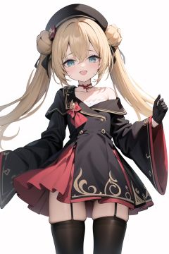 1girl, dress, double bun, hair bun, long hair, black dress, twintails, looking at viewer, smile, hat, bangs, brown hair, white background, solo, open mouth, blush, black headwear, very long hair, garter straps, thighhighs, bare shoulders, beret, :d, ribbon, black gloves, simple background, long sleeves, nail polish, black footwear, red ribbon, bow, gloves, wide sleeves, animal, hair ribbon, boots, red nails, sheath, sheathed, hair between eyes