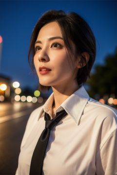 zenli, (8k, RAW photo, best quality, masterpiece:1.2), (realistic, photo-realistic:1.37), ultra-detailed,1 girl,cute, solo,beautiful detailed sky,detailed tokyo street,night, beautiful detailed eyes,(collared shirt:1.1),(short hair:1.2),floating hair