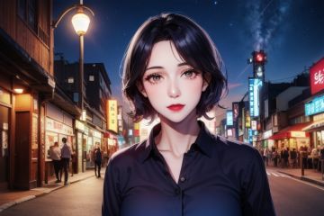 (8k, RAW photo, best quality, masterpiece:1.2), ultra-detailed,1 girl,cute, solo,beautiful detailed sky,detailed tokyo street,night, beautiful detailed eyes,(collared shirt:1.1),(short hair:1.2),floating hair