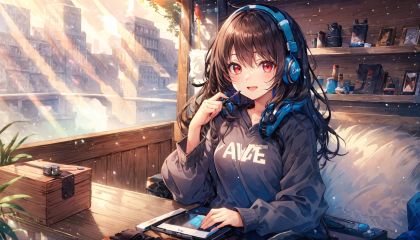 1girl, solo, Sitting, sitting_down, smile, , illustration, masterpiece,  best quality, beautiful face, young girl, long_hair,  black_hair, detailed eyes, red eyes, (upper body), cowboy shot, clear room, (guitar case), (headphones, tablet pc), ((computer, game console, box, chair, toy)), ((Play electric guitar)), (baggy clothes:1.4), light through window, (full body), <lora:EMS-30781-EMS:1.000000>, , <lora:EMS-14220-EMS:1.200000>