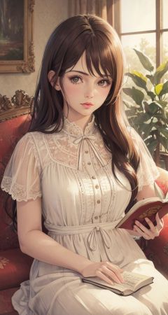 anime,(masterpiece, top quality, best quality, official art, beautiful and aesthetic:1.2),(1girl),upper body,extreme detailed,(fractal art:1.3),colorful,flowers,highest detailed,Ultra-realistic 8k CG,masterpiece,best quality,(photorealistic:1.4),HDR,absurdres,Professional,RAW photo,lens flare,(film grain:1.1),Bokeh,((Depth of field)),studio light, a woman in a white dress sitting on a couch reading a book in a room with a floral couch, 1girl, brown_hair, dress, lips, long_hair, open_book, reading, sepia, sheet_music, sitting, solo, Highly detailed,Professional,extreme detail description;,
