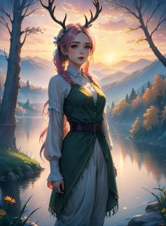 (1girl:1.5),look at viewer,(half body:1.2),colored hair,stand,(deer:1.3),sunlight penetrates through trees,lake,smoke,in spring,HDR,UHD,8K,best quality,extreme detail description,(EOS R8,50mm,F1.2,8K,RAW photo,Bokeh,,,