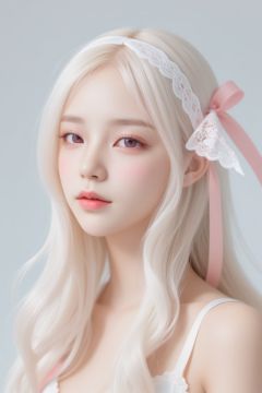 Beautiful girl, long white hair, white clothes, handsome face, fair skin,(((A lace ribbon covers both eyes))),pink silk eye mask covering the eyes, close up, side view, minimalist and dreamy flat illustrations, bright and soft colors,1girl,candy-coated