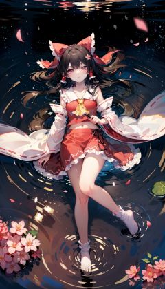 masterpiece, ultra detailed,((from above ,socks, lying, underwater, floating hair, starry sky reflection, floating sakura petals, rippling)),[half closed eyes],(pink eyes),(high contrast:0.8),1girl,solo, hakurei_reimu, hair_tubes, detached_sleeves, solo, bow, long_hair, frills, ribbon_trim, red_bow, hair_bow, ribbon-trimmed_sleeves, wide_sleeves, red_skirt, skirt, looking_at_viewer, ascot, stairs, frilled_bow, black_hair,<lora:水润RenalithV4(改):0.6>,<lora:博丽灵梦:0.9> <lora:n,eg4all_bdsqlsz_V3.5:1.2>