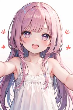 1girl, solo,looking at viewer, bangs,collarbone, blush,bare arms, bare shoulders, reaching out,close range, low tied,solo locks,child,small breasts,bare shoulders,blush,light smile,open mouth, winking, standing,upper body, pink long hair,simple background,red eyes, symbol-shaped pupils, very_long_hair,
