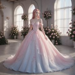 masterpiece, 1 girl, 22 years old, Look at me, Exquisite makeup, Pink hair., Long hair, white wedding dress, Wipe the chest, Indoor, Exquisite decoration, Bright light, Stand, In the middle of the picture, Whole body, Plenty of roses, textured skin, super detail, best quality,Future City,FilmGirl,blue and white porcelain