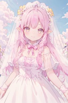 pink hair, yellow eyes, hair cover one eye, pointy ears, long hair, hair flower, Lateral hair,