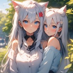 animal ears, blue eyes, hair ornament, looking at viewer, long hair, bangs, hair between eyes, off shoulder, hair flower, animal ear fluff, blush, 1girl, white shirt, bare shoulders, shirt, upper body, blurry background, multiple views, jewelry, earrings, hairclip, closed mouth, sailor collar, blue hair, blurry, flower, white hair, looking back, extra ears, cat ears, parted lips, outdoors