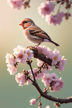 a tiny finch on a branch with spring flowers on background:1.0, aesthetically inspired by Evelyn De Morgan, art by Bill Sienkiewicz and Dr. Seuss, ray tracing, volumetric lighting, octane render