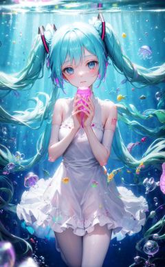chiaroscuro, jellyfish, hatsune miku, long hair, dress, 1girl, underwater, very long hair, twintails, blue theme, closed eyes, bubble, white dress, air bubble, bangs, blue hair, solo, fish, bow, water,pale skin
