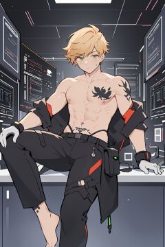 1boy, topless,muscular, Cyberpunk, cyberprosthesis, white circuit,blond hair, green eyes,neon tattoo,circuits, electronic components,feet out of frame, undercut,aged up,