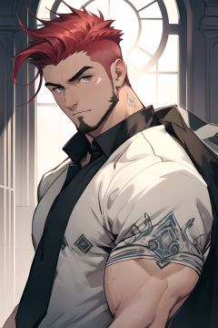 1boy,topless,stubble,facial hair,mature male ,muscular,red hair,heterochromatic eyes, floating palaces, fine, beautiful eyes, Beautiful and delicate hair, delicate face, Complex court suits, complex clothing, detailed clothing decoration ,male focus, undercut,short hair,