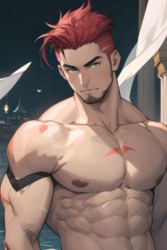 1boy,topless,stubble,facial hair,mature male ,muscular,red hair,heterochromatic eyes, floating palaces, fine, beautiful eyes, Beautiful and delicate hair, delicate face, Complex court suits, complex clothing, detailed clothing decoration ,male focus, undercut,short hair,