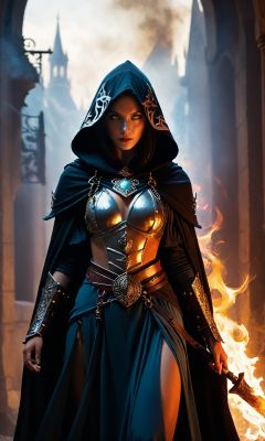 1 female   magehoodarmor  dresscasting fire spellsglowing eyesdramatic lighting shadowdark, digital, fantasy, gothic, horror, messy,   surreal(art by Richard Anderson)