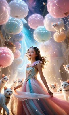In a fantastical realm, a young girl stands amidst a swarm of adorable winged cats. She dons a dazzling princess gown adorned with twinkling stars that reflect a multitude of colors. The backdrop paints a surreal dreamscape with vibrant pink and pure white hues. Above, whimsical and surreal clouds twist and swirl, creating an otherworldly atmosphere. The composition plays with exaggerated angles and perspectives, infusing the scene with dynamism. Special effects include a subtle ethereal glow around the cats and the girl's joyful expression. The lighting is cinematic, with soft, diffused illumination that adds a dreamlike quality. The result is a mesmerizing and emotional visual experience, captured in high detail and rendered in HDR.
