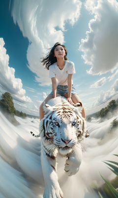 An impressionistic image of a girl astride an enormous white tiger soaring amidst the clouds. The scene is filled with swirling,dreamlike effects that enhance the surreal atmosphere. The composition uses rule of thirds to frame the girl and her majestic mount. Soft focus and a pastel color palette create a fantastical ambiance. Shot with a fisheye lens for a wide-angle perspective.,