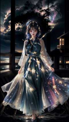 masterpiece, best quality,highres, 1girl, stars in the eyes, see_through, (((glistening light))), (Luminous), detailed shadow, meteor, stars, galaxy, nebula, stars in dress, messy floating hair, colored inner hair, Starry sky adorns hair, chiffon, tullece, <lora:fanxing:0.7>, hanfu,  <lora:hanfu_v30:0.4>