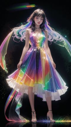 masterpiece, best quality,highres, 1girl, tall, long hair, perfect stature, white dress, fashion pose, bangs, chromatic dispersion,metallic_lustre, see_through, (tansparent_plastic:1.3), coloured glaze, Polychromatic prism effect, rainbowcore, iridescence/opalescence, glowing colors, aluminum foil, Glowing ambiance, (portrait:1.5), black background, full body, <lora:liuli2:0.7>,