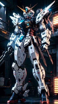 BJ_Gundam, solo, green_eyes, standing, weapon, no_humans, glowing, robot, mecha, clenched_hands, science_fiction, v-fin, mobile_suit,cinematic lighting,strong contrast,high level of detail,Best quality,masterpiece,<lora:Gundam_Mecha_v3.1:0.7>,