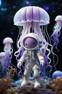 An astronaut is surrounded by blue and purple jellyfish,in space,with the moon and planets in the background,no_humans,tentacles,Full of dreams,3D,high resolution,High quality,amazing work,masterful work,science fiction,star,BJ_Sewing_doll,<lora:SDXL_Sewing_dol_v2:0.7>,<lora:star:0.6>,