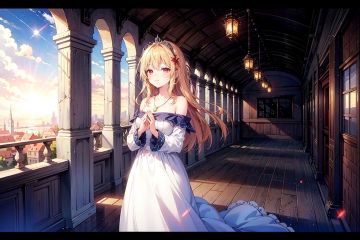 wide shot, (depth of field), illumination, soft shadows, grand scene, backlight, lens flare, ((colorful refraction)), ((cinematic lighting)), (standing on the balcony), evening, sunlight, skyline, ancient house, medieval, blonde hair, long hair, messy hair, closed eyes, red, eyes, praying, princess, crown, white dress, red gemstone necklace, red eyes, **ile, bare shoulder, mid shot, upper bodyblurry background, blurry, <lora:EMS-30781-EMS:0.600000>, , <lora:EMS-27163-EMS:0.400000>