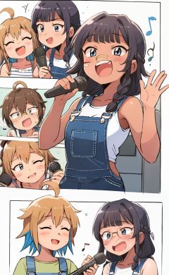 masterpiece, best quality,, <lora:style05:1>,multiple girls, overalls, black hair, blonde hair, microphone, closed eyes, glasses, 6+girls, multiple boys, open mouth, brown hair, smile, bandaid on face, blue eyes, long hair, music, braid, musical note, fang, **** top, singing, multicolored hair, short hair, ahoge, dark skin, orange hair, holding, purple hair, ^_^, white background, blush, food, bandaid on nose, bandaid, grey hair, simple background, blush stickers, :d, holding microphone, instrument, bangs, shirt, single braid, dark-skinned female, eighth note, white shirt, hood, two-tone hair, blue overalls