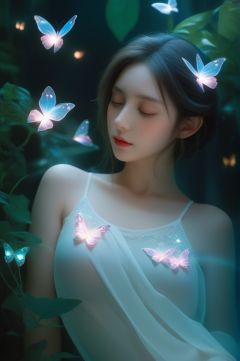 Cinematic of,(fairy girl),cool_vibe,small_nose,realistic artwork,high detailed,professional,upper body photo of a transparent porcelain cute creature,with glowing backlit panels,anatomical plants,dark forest,grainy,shiny,with vibrant colors,colorful,((realistic skin)),glow surreal objects floating,((floating:1.4)),contrasting shadows,photographic,niji style,1girl,xxmixgirl,FilmGirl,aura_glowing,colored_aura,Movie Still,final_fantasy_vii_remake,((big_breast:1.1)),transparent_clothing,(transparent_butterflies are part of her body),sleeping:1.4,((depth_of_field)),