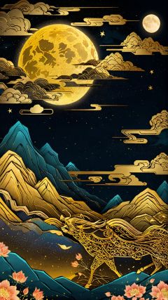 (Chinese gilt illustration style) complex details,  clouds,  sky,  mountains,  flowers,  moon,  night,  lights, <lora:EMS-37277-EMS:0.800000>