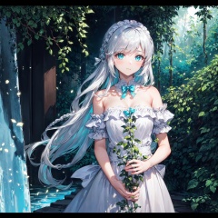 1girl, cold theme, broken glass, broken wall, aqua theme, white hair, blinking, white dress, closed mouth, constel lation, flat color, noline art, white hair, braid, blinking,maid, detached collar, bare shoulders