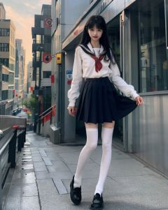 (((masterpiece))), (((best quality))), ((ultra-detailed)), (illustration), (detailed light),((an extremely delicate and beautiful)),(beautiful detailed eyes),1girl, long hair,black hair,light smile, hair clip, hairclip,school uniform,plaid skirt,white thighhighs,legs,loafers,((black footwear)),standing,full body,road,city,day,looking_at_viewer,<lora:gxwb:0.4>, <lora:jyy:0.7>
