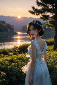 1 girl, 32k, look at viewer, charming, nature landscape, Wide Short, masterpiece, best quality, nature light, sunset background, Flower Wreath, ultra realistic,