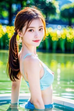 a portrait of a 18yo woman bathing in a river,body contact water and ripple around,
