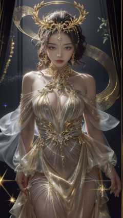 masterpiece, best quality,highres, 1girl, <lora:jinmeng:0.7>, jinmeng, golden dress, sparkle, see-through, layered dress, jewelry