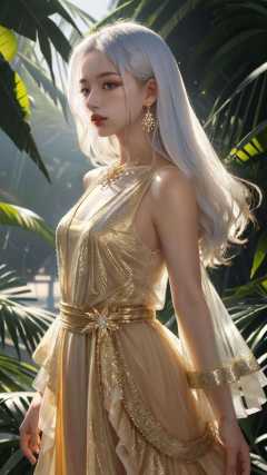 masterpiece, best quality,highres, 1girl, jinmeng, golden layered dress, sparkle, see-through, jewelry, white hair, sunlight,  <lora:jinmeng:0.8>