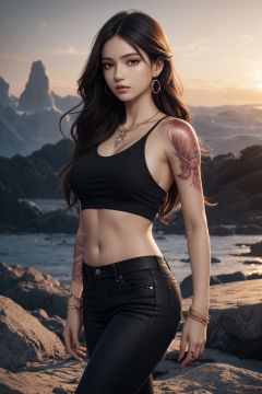 (masterpiece) , ((best quality)), (( 8k wallpaper)), ((ultra high resolution)), good composition, (ultra-detailed), illustration, beautiful art, artistic, realistic, beautiful, good art, scenery, cinematic, detailed skin, (oily skin), glossy skin, fine skin, (beautiful hair), (beautiful eyes), (perfect anatomy), (correct limb), (realistic), hand with five delicate fingers, cute girl, a woman posing for the camera that is wearing some black pants and has a cropped top on, 1girl, jewelry, solo, ring, earrings, long hair, bracelet, shirt, brown hair, tattoo, hand on hip,sunset