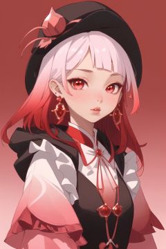 wanxiang,1girl, earrings, red_background, jewelry, solo, looking_at_viewer, upper_body, frills, hat, lips, clothes_writing, gradient, hood, gradient_background, nose, bangs