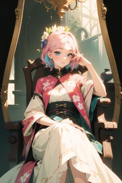 1girl Sitting on a chair,broken mirror,(masterpiece, top quality, best quality, official art, beautiful and aesthetic:1.2), (1girl), extreme detailed,flowers,(fractal art:1.3),colorful,highest detailed,,Real photos, real photography, (real skin texture),(realistic)