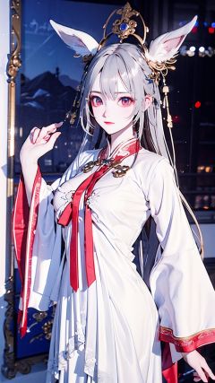 (guanyin:1.3),(1girl:1.8),(solo:1.8), beautiful, ultra realistic, ultra clear image quality, 8k, exquisite landscape background, enchanting figure,hand placed behind, background with Holy Light Rune flashing, soft light. The water below shimmered with light. The other shore flower has a large chest, a navel exposed, Official art, unit 8K wallpaper, ultra detailed, beautiful and aesthetically pleasing, masterpiece, best quality, very detailed, dynamic angle, paper skin, elegant, fauvi** design, visual color, romantici**, divine realm In a painting, standing on sea, and her presence radiates strength. (Masterpiece, best quality, more details, vertical, realistic, realistic, one detail, clear focus, movie lighting), ray tracing, ultra wide angle, 4K, award-winning,1 little girl, masterpiece, highest quality, high quality, cute, white hair, Rabbit ears, plump figure, exposed white dress, (red eyes:1.3), sparkling eyes, shy expression, big_breast,huliya,1 girl,yuyao