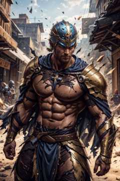 4rmorbre4k, torn clothes, broken armor, debris, injury, pained expression, pectorals, abs, fighting stance, dynamic pose, medieval fantasy city background, paladin armor, cross, cape, helmet, close up, face portrait,, best quality, masterpiece, realistic, (detailed background), depth of field, intricate details, 8k, art by greg rutkowski, detailed skin texture, detailed face, realistic eyes, male focus, photo of a man,