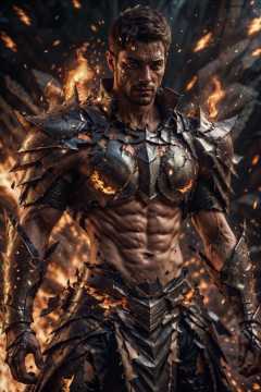 4rmorbre4k, torn clothes, broken armor, debris, injury, pained expression, embarrassed, blush, pectorals, abs, fighting stance, dynamic pose, medieval fantasy background, close up, face portrait, emb3r4rmor, wearing embers knight armor, glowing, burning, best quality, masterpiece, realistic, (detailed background), depth of field, intricate details, 8k, art by greg rutkowski, detailed skin texture, detailed face, realistic eyes, male focus, photo of a man,