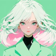 mint green and pink, minimalism,  solo,  yellow background,  white hair,  1girl,  looking at viewer,  simple background,  purple eyes,