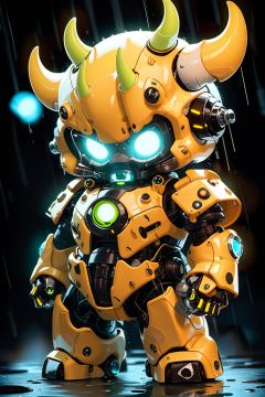 BJ_Monster,solo,cow,green_eyes,standing,horns,chibi,no_humans,glowing,robot,mecha,glowing_eyes,science_fiction,rain,cinematic lighting,strong contrast,high level of detail,Best quality,masterpiece,White background,<lora:Oil_sucking_monster(4500):0.7>,
