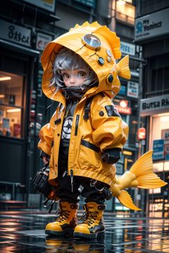 BJ_Monster,solo,long_sleeves,standing,jacket,full_body,male_focus,boots,outdoors,pants,hood,black_footwear,blurry,black_eyes,blurry_background,1other,colored_sclera,reflection,fish,rain,yellow_jacket,raincoat,yellow_raincoat,cinematic lighting,strong contrast,high level of detail,Best quality,masterpiece,White background,<lora:Oil_sucking_monster(4500):0.7>,