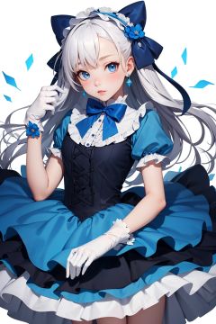 qzclothesdesign, dress, 1girl, frills, frilled dress, bow, blue dress, lolita fashion, puffy sleeves, solo, blue bow, gloves, jewelry, gem, short sleeves, layered dress, flower, puffy short sleeves, white gloves, three visions
