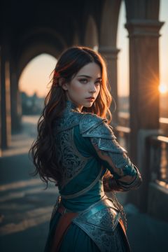 (absurdres, highres, ultra detailed)(masterpiece), (extremely intricate:1.3), (realistic), portrait of a girl\( the most beautiful in the world, (medieval armor), metal reflections, upper body, look back\), sharp focus, BREAK, outdoors, intense sunlight, far away castle, dramatic, award winning, cinematic lighting, , volumetrics dtx, (film grain, blurry background, blurry foreground, bokeh, depth of field, sunset, motion blur:1.3), chainmail, exposure blend, medium shot, bokeh, (hdr:1.4), high contrast, (cinematic, teal and orange:1.4), (muted colors, dim colors, soothing tones:1.3), low saturation
