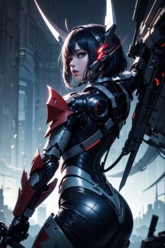 official art, unity 8k wallpaper, ultra detailed, beautiful and aesthetic, masterpiece, ultra quality, ultra detailed, 1girl, mecha armor, mecha headgear, black gradient blue hair, abandon modern city neon light, extremely detailed, dynamic angle, vivid colours, atmospheric, large sword