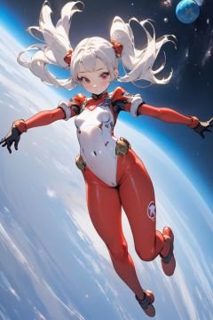 Animation style, MG_jixie,  1girl,  solo,  twintails,  white hair,  long hair,  bodysuit,  space,  breasts,  parted lips,  looking at viewer,  medium breasts,  science fiction,  gloves,  floating hair,  planet,  skin tight,  floating,  white bodysuit,  sky,  spacesuit,  red gloves,  machine,  Looking Angle,  Outer space, <lora:EMS-36468-EMS:1.200000>